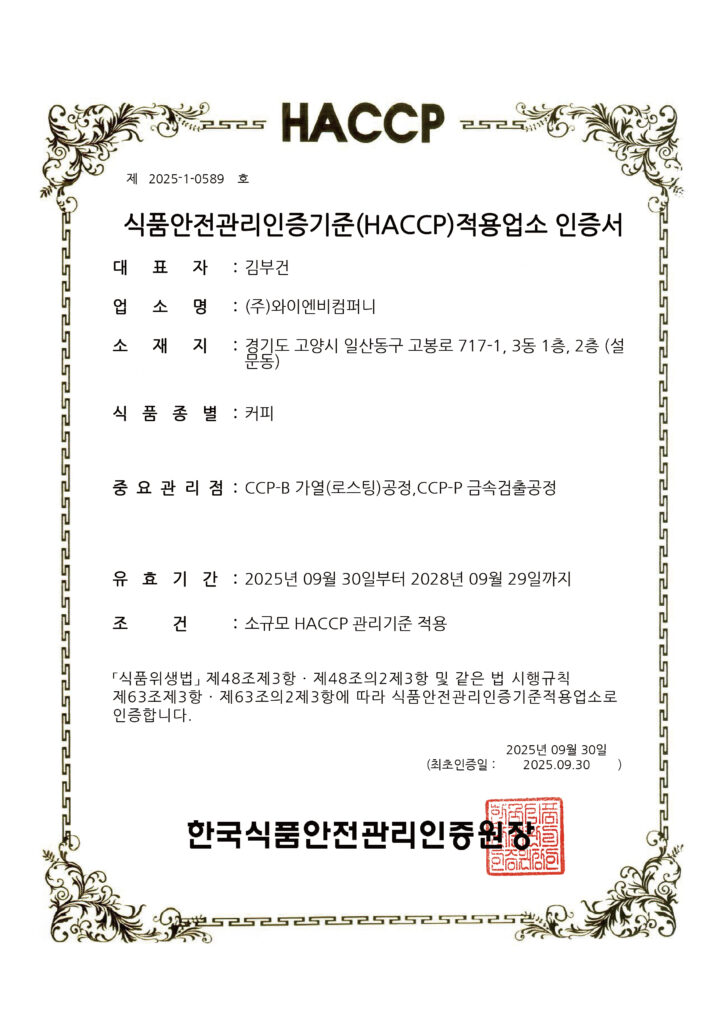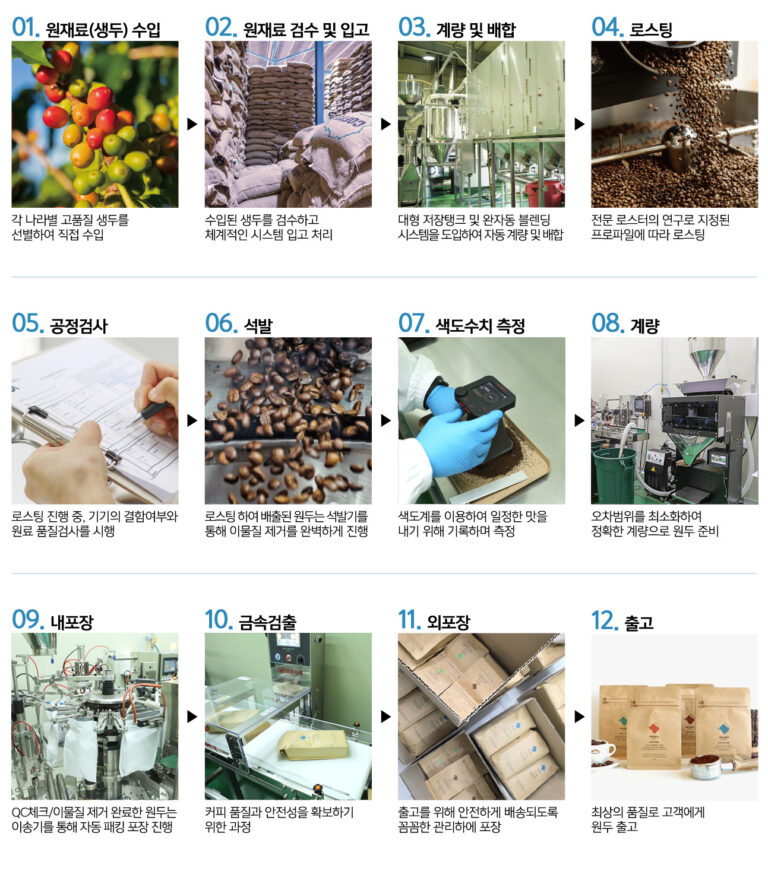ISO 기준을 준수해 생두 수입부터 생산까지 전 과정을 체계적으로 관리합니다.
